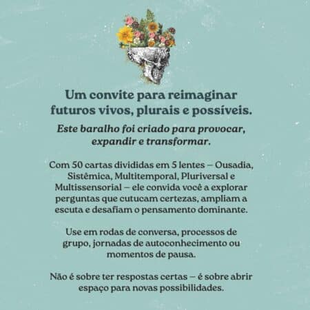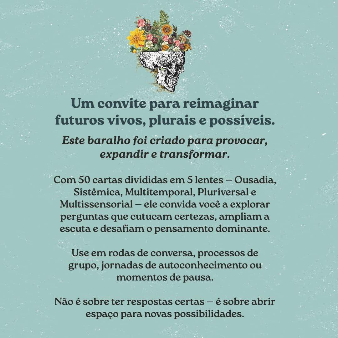 Com 50 cartas divididas em 5 lentes para vislumbrarmos futuros que desejamos viver – Ousadia, Sistêmica, Multitemporal, Pluriversal e Multissensorial – ele convida você a explorar perguntas que cutucam certezas, ampliam a escuta e desafiam o pensamento dominante.