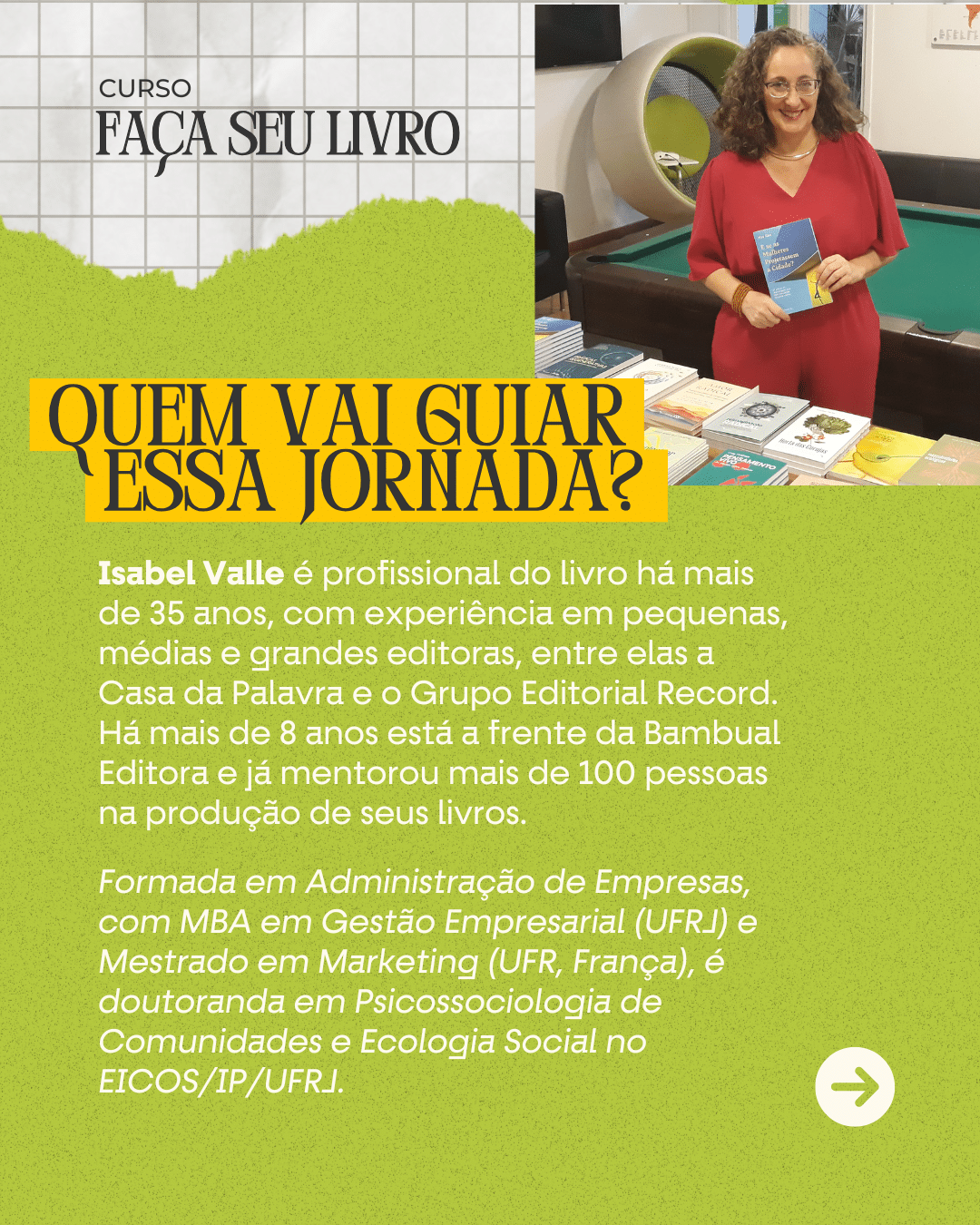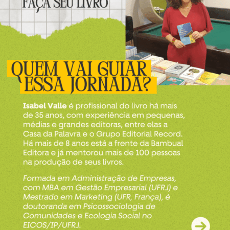 Isabel Valle é profissional do livro há mais de 35 anos, com experiência em pequenas, médias e grandes editoras, entre elas a Casa da Palavra e o Grupo Editorial Record. Há mais de 8 anos está a frente da Bambual Editora e já mentorou mais de 100 pessoas na produção de seus livros.